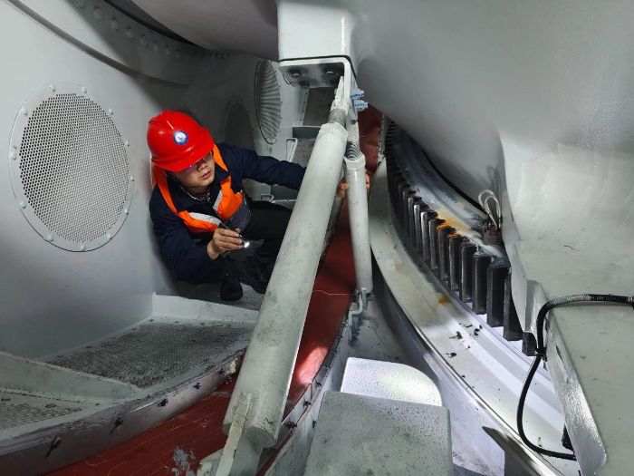▲突擊隊成員在風機機艙開展偏航系統檢查 攝影:郭逸博