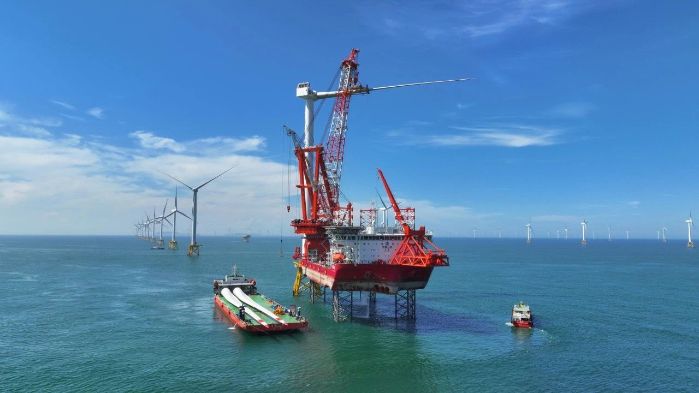 ▲全球首臺16兆瓦超大容量海上風機吊裝現場? 三峽傳媒供圖