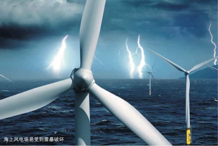 近海地區(qū)強對流天氣多發(fā)、空氣濕潤,容易形成雷暴。海上風力機矗立在平坦的海面上,同時水氣和鹽霧又會在葉片表面聚集,使得風力機易于遭到雷電襲擊。最可能被雷擊損害的部件是位于風力機最高點的葉片;風力機內(nèi)部控制系統(tǒng)被雷電流干擾,會導致風力機不能動作或做出錯誤動作;雷電流還會在機艙內(nèi)部金屬間隙產(chǎn)生火花,引起火災(zāi)和爆炸。
