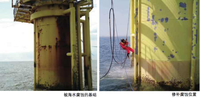 避免腐蝕的另一種常用方法是在鋼結(jié)構(gòu)表面施以由環(huán)氧樹脂構(gòu)成的防腐涂層來隔絕海水。目前,海上風電的防腐常將這兩種方法結(jié)合起來,在涂料中加入大量鋅粉或鋁粉,成為犧牲陽極。一旦涂層的阻隔作用削弱,就用犧牲陽極來保護。
