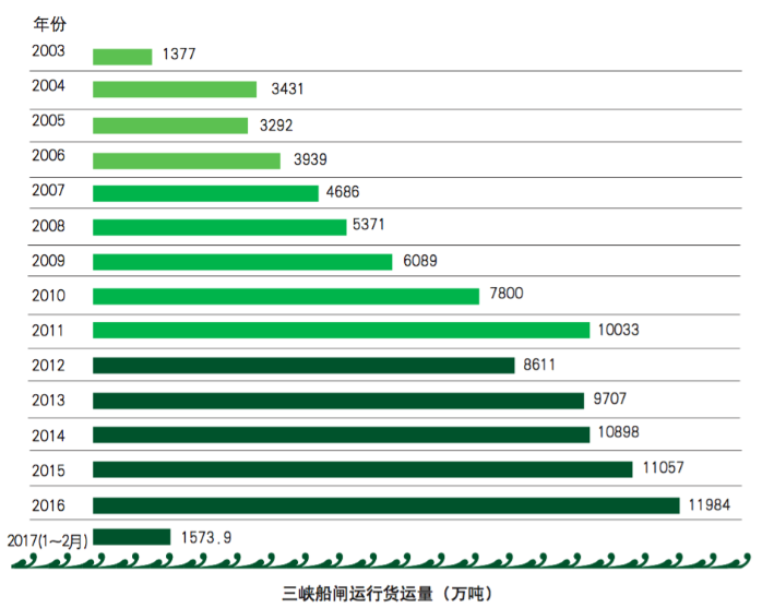 投入運(yùn)行以來,三峽船閘過閘貨運(yùn)量逐年遞增,2011年首次突破億噸,提前19年達(dá)到設(shè)計(jì)能力。2014年至2016年連續(xù)3年貨運(yùn)量突破億噸。截至2017年3月7日,三峽船閘累計(jì)運(yùn)行12.87萬閘次,過船73.1萬艘次,通過旅客1181.5萬人次,貨運(yùn)量10.01億噸。