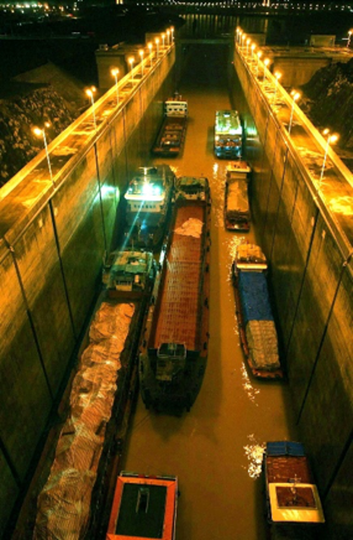 三峽大壩上下游之間水位的最大落差達113米,船舶從下游駛往上游(或從上游駛往下游),必須通過三峽船閘或垂直升船機。人們形象地比喻船舶通過三峽船閘過壩是“爬樓梯”,船舶乘垂直升船機過壩是“坐電梯”。
