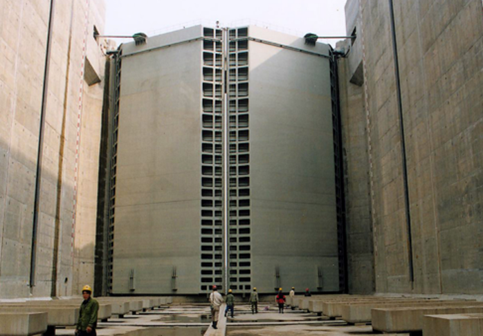 假如船舶要從大壩下游駛向上游——當船舶駛入承船廂,關閉承船廂下游閘門,承船廂通過爬升裝置上升,直到承船廂內水位與上游水庫水位齊平時,打開承船廂上游閘門,船舶駛出承船廂進入上游航道。船舶從上游向下游行駛,與其過程相反。一艘船“乘坐”垂直升船機過壩,約需40分鐘。
